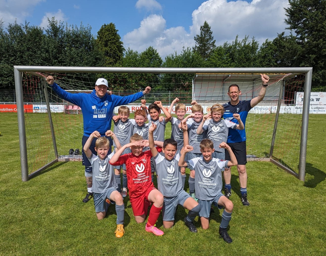 Die jungen Kicker vom Kanal konnten die Saison schließlich mit 25 Punkten, d.h. 8 Siegen, 5 Niederlagen und einem Unentschieden beenden, das ganze mit einem Torverhältnis von 71:40. Besonders hervorzuheben ist der grandiose Endspurt der letzten drei Spiele, hier konnte unser Torwart dreimal seinen Kasten sauber halten und es wurden 31 Tore geschossen. Die Kanalkicker haben sich mit Spielwitz, Zusammenhalt und Siegeswillen selbst belohnt. Das Trainerteam ist höchst zufrieden mit den Leistungen und stolz auf ihre Schützlinge. Am vergangenen Samstag wurde die Saison mit einem 12:0 Sieg bei der JSG Leer/Horstmar 2 beendet, anschließend gab es bei den Eltern eine La-Ola Welle und selbstverständlich eine ordentliche Wasserdusche, womit die Eltern nicht gerechnet haben. Das komplette Team freut sich nun auf Samstag, denn dort feiert der SC Altenrheine im heimischen Sportpark seinen 75. Geburtstag und es gibt über den Tag verteilt diverse Spiele und Aktivitäten für groß und klein.