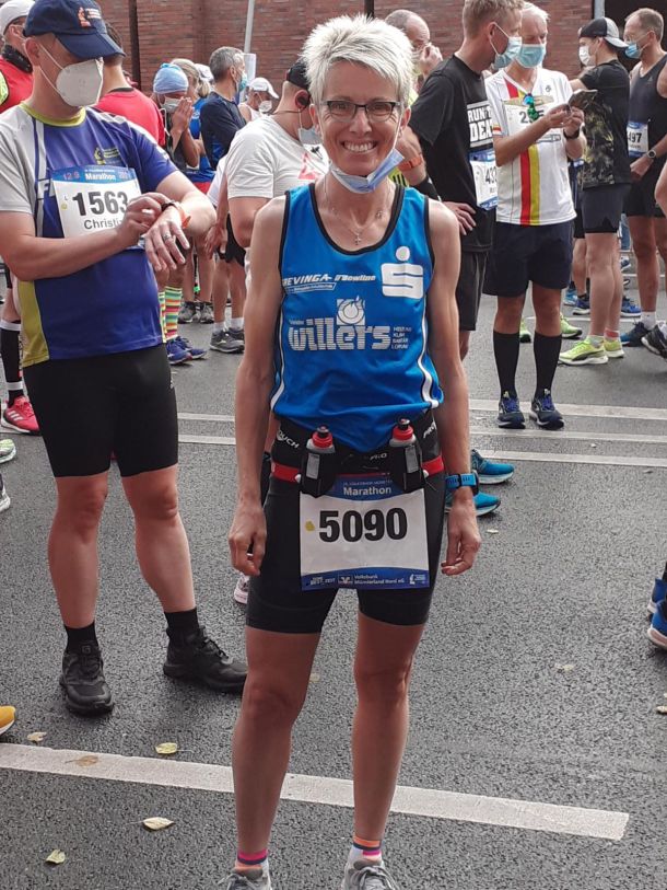 Ingrid König freute sich auf die klassische Strecke, denn lange wurde sie durch eine Verletzung ausgebremst und konnte die langen sowie anspruchsvollen 42 Kilometer nicht in Angriff nehmen. Mit 53 Minuten Nettolaufzeit für die ersten 10.000 Meter lag sie voll im Plan. Auch die restlichen Kilometer spulte die erfahren Ausdauersportlerin souverän ab. Auf dem Prinzipalmarkt in Münster wurde sie zwar nicht wie in den letzten Jahren von tausenden von Zuschauer begrüßt, aber trotzdem war Ingrid König mit der Zeit von 3:55 Stunden zufrieden.Ingrid König und Christian Wesendahl nutzten die 42 Kilometer lange Wettkampfstrecke direkt vor der Haustür. In Münster waren fast 9000 Läufer am Start. Viele Teilnehmer auch als Staffel. Christian Wesendahl nutze den Marathon als letzten, der wenigen sportlichen Höhepunkte im Sportjahr 2021. Die anvisierten Triathlonwettkämpfe wurde größtenteils abgesagt, so entschloss sich Wesendahl die 42 Kilometer ohne gezielte langfristige Marathonvorbereitung in Angriff zu nehmen. Die ersten 10 Kilometer und auch der Halbmarathon liefen noch sehr gut. Die 21 Kilometer absolvierte er in 1:36 Stunde. Dann wurden die Beine schwerer und der Altenrheiner musste das Tempo herausnehmen. Nach 3:18:20 Stunden erreichte er auf dem Prinzipalmarkt in Münster das Ziel und verbesserte seine Bestzeit um 2 Minuten.Ingrid König Münster Marathon