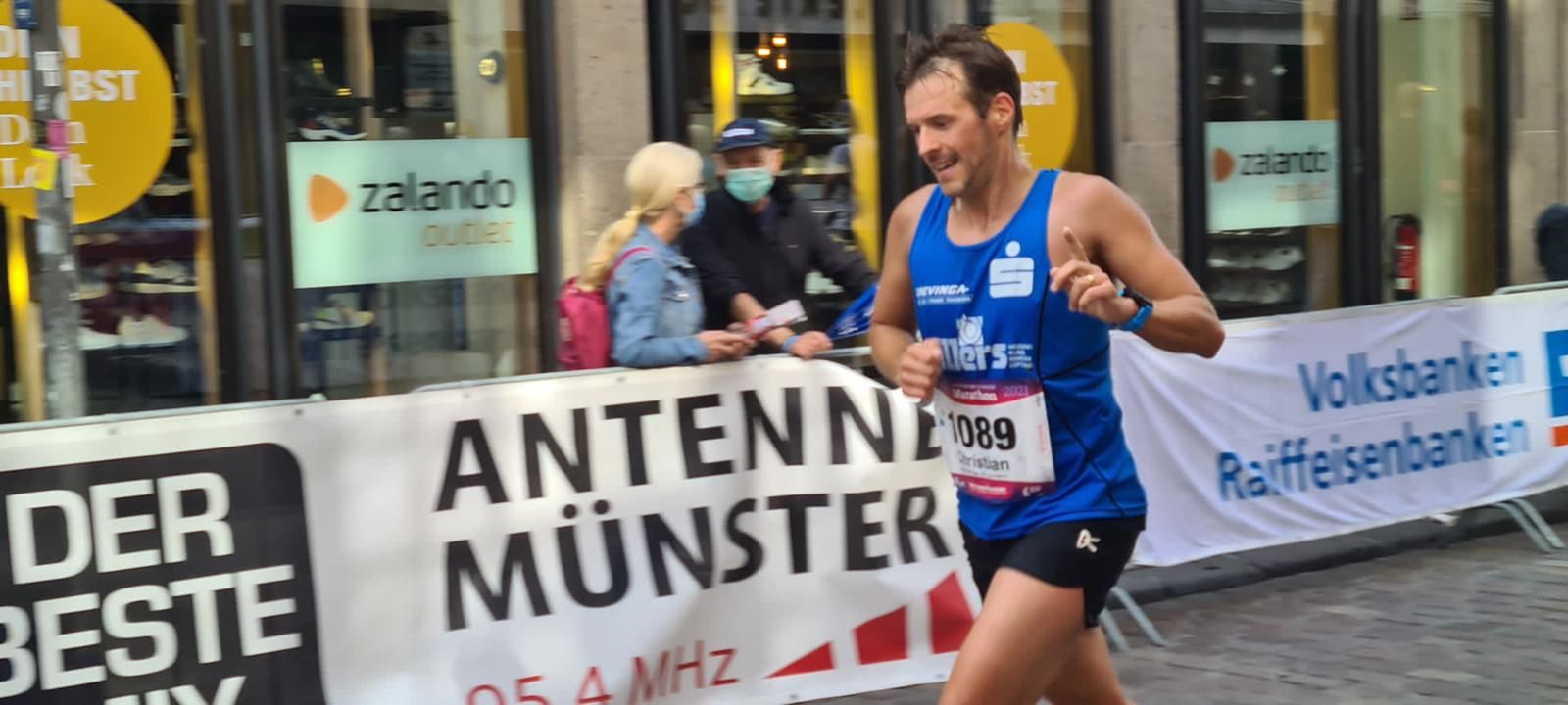 Ingrid König und Christian Wesendahl nutzten die 42 Kilometer lange Wettkampfstrecke direkt vor der Haustür. In Münster waren fast 9000 Läufer am Start. Viele Teilnehmer auch als Staffel. Christian Wesendahl nutze den Marathon als letzten, der wenigen sportlichen Höhepunkte im Sportjahr 2021. Die anvisierten Triathlonwettkämpfe wurde größtenteils abgesagt, so entschloss sich Wesendahl die 42 Kilometer ohne gezielte langfristige Marathonvorbereitung in Angriff zu nehmen. Die ersten 10 Kilometer und auch der Halbmarathon liefen noch sehr gut. Die 21 Kilometer absolvierte er in 1:36 Stunde. Dann wurden die Beine schwerer und der Altenrheiner musste das Tempo herausnehmen. Nach 3:18:20 Stunden erreichte er auf dem Prinzipalmarkt in Münster das Ziel und verbesserte seine Bestzeit um 2 Minuten.