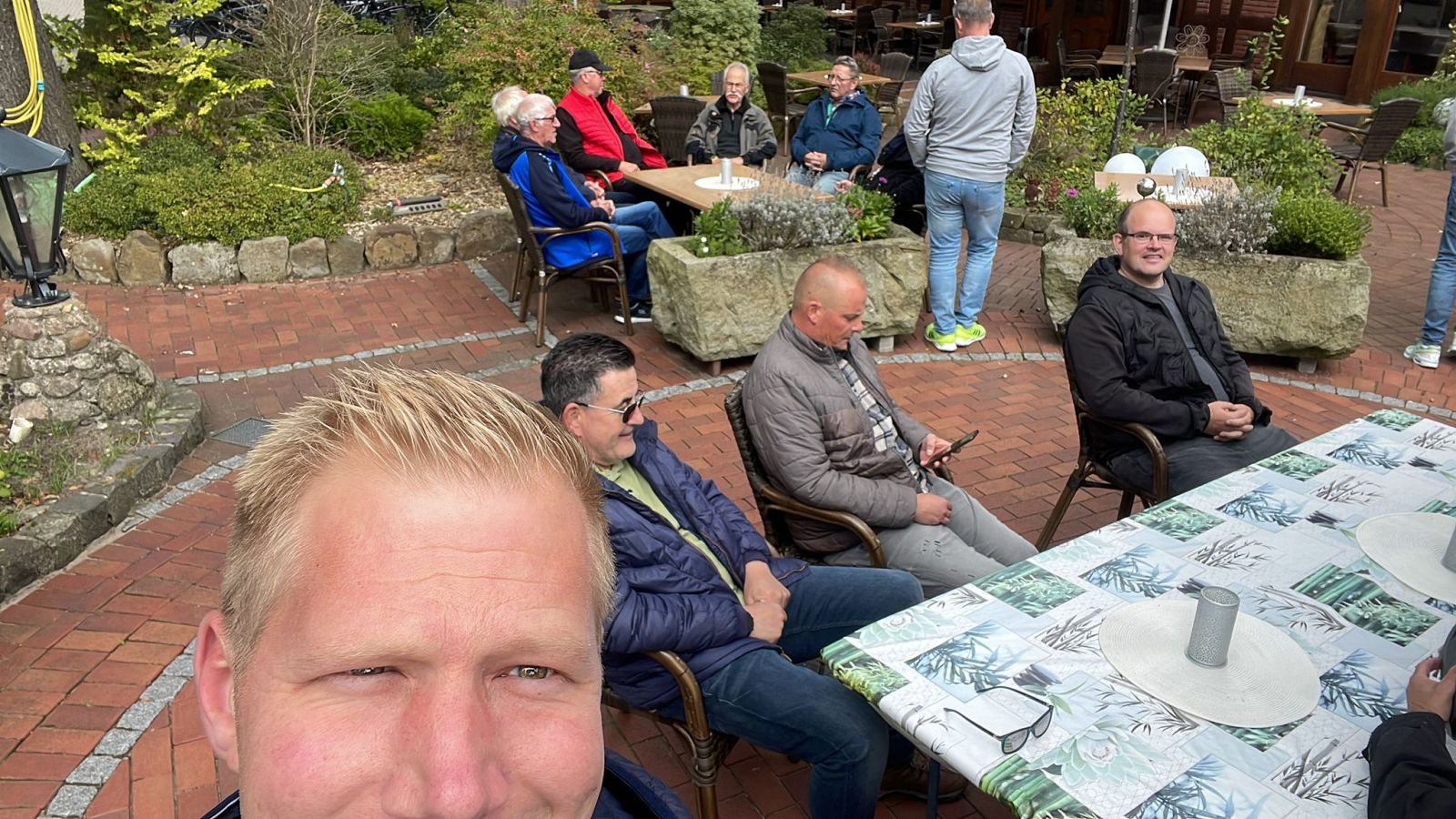 Ein besonderes Ziel der diesjährigen Radtour war der Besuch bei Teamkameraden Jürgen Wortmann. Jürgen, der vor Kurzem einen schweren Unfall erlitten hatte und deshalb nicht an der Tour teilnehmen konnte, wurde mit dem Besuch überrascht. Er wohnt am Fuße des Dickenbergs und war sichtlich erfreut über das Erscheinen seiner Kameraden. Bei ihm angekommen, wurden die Radfahrer herzlich empfangen. Zur Stärkung gab es Bier und Canapés, was für gute Stimmung sorgte und die Kameradschaft innerhalb der Truppe weiter festigte.
