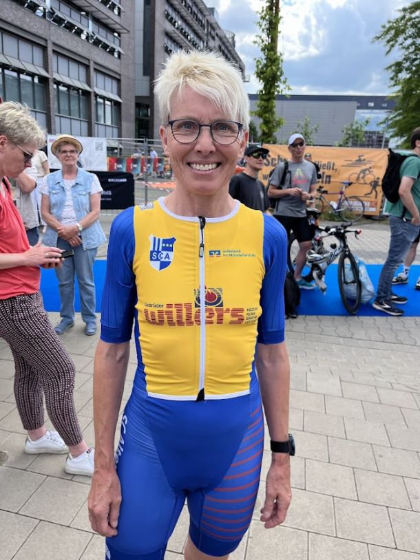 Das Hafenbecken mitten in der Innenstadt von Münster bildete den Dreh- und Angelpunkt dieses Citytriathlon, bei dem der SCA mit einem Großaufgebot von 15 Sportlern gemeldet war. Sehr zuschauerfreundlich lag die 1350 Meter lange Schwimmstrecke direkt im Zentrum von Münster. Vor jedem Start sorgten nicht nur die vielen tausend Zuschauer, sondern auch der Veranstalter mit passender Musik sowie Moderation bei den Teilnehmern für Gänsehaut. Wer geglaubt hat, in Münster auf eine topfebene Radstrecke zu treffen, der sah sich schnell getäuscht. Es waren zwar keine Anstiege wie im Teutoburger Wald, aber die zwei Radrunden hielten auf ihren jeweils 20 Kilometern etliche längere Anstiege für die weit über 1000 Aktiven parat. Beim Laufen wechselten typische Citytriathlon-Strecken, sprich mitten durch die Stadt, mit längeren Passagen am Kanal. So wurden die zehn Laufkilometer nie langweilig.