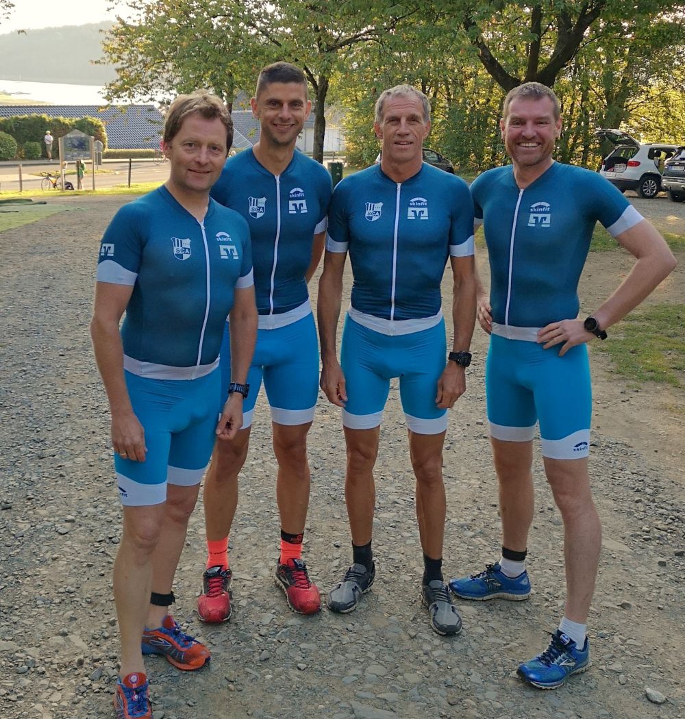 Aber warum freuen sich Ausdauersportler auf so eine Herausforderung, wie kleine Kinder auf ihren Geburtstag? „Genau weil es eine Herausforderung ist. Knapp fünf Stunden dauert nicht nur der Kampf mit der Strecke und sich selbst, sondern auch das Erlebnis“ beschreibt Michael Heckhuis die Motivation für einen solchen Wettkampf. Beim dritten Start der Verbandsliga Nord war die Bevertalsperre die Bühne für die erste Disziplin. Ralf Uhlenbruch machte sich nach 33:15 Minuten als erster SCler in Richtung Wechselzone auf. Christoph Dirkes benötigte nur knapp eine Minute länger. Auf zwei Rädern mussten vier Runden gefahren werden, die alles boten, aber auch viel abverlangten, was ein Triathlet sich von der zweiten Disziplin wünscht. In jeder Runde ging es in der ersten Hälfte mit knackigen Steigungen in Richtung höchsten Punkt, der auch landschaftlich der reizvollste war. Kleine Landstraßen, die sich durch grüne Wiesen zogen und immer wieder durch kleine Ortschaften führten. Ab der Mitte der Runde ging es dann immer wieder rasant bergab. Mit Tempo 65 fuhren die Dreikämpfer wieder Richtung Bevertalsperre. Einige Kurven verlangten viel Konzentration und sehr gute Steuerkünste. Christoph Dirkes, der Mitteldistanzspezialist des SC Altenrheine, fuhr mit 2:15 Stunden eine der schnellsten Radzeiten in der Verbandsliga und überholte schon in der ersten Runde seinen Vereinskollegen Uhlenbruch. Auch Ricklin bewies als ältester Teilnehmer der Verbandsliga sein Talent auf zwei Rädern. Nach dem Radfahren ging es von der Wechselzone aus fünf Kilometer stetig bergab Richtung Hückeswagen. Bergab hört sich einfach an, ist für die Muskulatur aber extrem anspruchsvoll nach der Vorbelastung durch das Rad fahren. Bei sehr sommerlichen Temperaturen waren die Verpflegungsstände heiß ersehnten. Dirkes zog bei seiner fünften Mitteldistanz in diesem Jahr souverän seine Laufrunden. Nach 4:31:39 Stunden erreichte er das Ziel. Als 14. der Verbandsliga und Fünfter der AK 40 in der Wertung der NRW-Landesmeisterschaften schloss er den Wettkampf ab. Elf Minuten später machte auch Uhlenbruch den letzten Laufschritt über die Ziellinie. Bei den Landesmeisterschaften reichten die 4:42:29 Stunden für den siebten Platz in der AK50. Manfred Ricklin musste sich diesmal geschlagen geben und mit dem Vizetitel in der AK 60 Vorlieb nehmen. Aber nach 4:52:52 Stunden war er sichtlich erschöpft, aber auch zufrieden mit seiner Leistung. Fünf Jahre älter, aber die gleiche Zeit erreicht. Michael Heckhuis komplettierte nach 5:15:49 Stunden die Verbandsligamannschaft des SC Altenrheine.