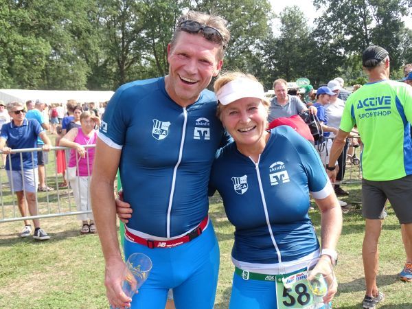 Den Auftakt machten die Teilnehmer der olympischen Distanz. Nach vier Jahren Abstinenz, die durch etliche Verletzungen gekennzeichnet waren, wollte Norbert Philipp wieder einen Triathlon ins Ziel bringen. Beim Schwimmen über 1500 Meter zeigte er gleich wieder seine Klasse und war nach 23:10 Minuten als Vierter in der ersten Wechselzone. Auf dem Rad wurde er dann von dem furios auftrumpfenden Christian Dudek überholt. Mit einer der schnellsten Radzeiten für die 40 Kilometer fuhr Dudek bis auf den neunten Rang vor. Auch beim Laufen, es mussten zwei Runden je fünf Kilometer gelaufen werden, verteidigte er diesen Platz. Als sehr guter Neunter der Gesamtwertung und Dritter der AK 50 lief der SCler nach 2:19 Stunden ins Ziel. Norbert Philipp platzierte sich auf dem dritten Rang der AK 55 mit einer Endzeit von 2:26 Stunden. Eigentlich wollte Petra Romberg nur mal wieder bei einem Triathlon reinschnuppern. Doch dann lief es beim olympischen Triathlon so gut, das sie in der AK 45 nicht zu schlagen war. Den Grundstein für ihren Sieg legte sie beim Radfahren, so dass sie nach 2:37 Stunden die insgesamt 51,5 Wettkampfkilometer absolviert hatte. Guido Wilke bestritt über alle drei Disziplinen ein ausgeglichenes Rennen. Nach 2:56 Stunden finishte er als 15. der AK 50.