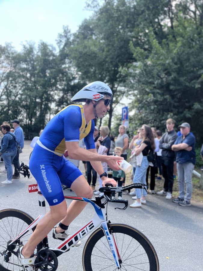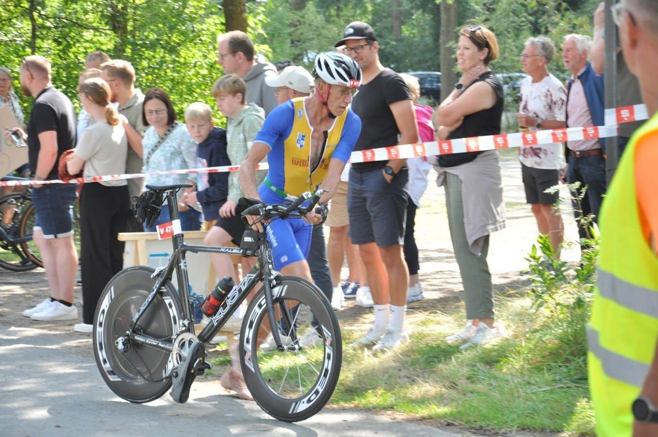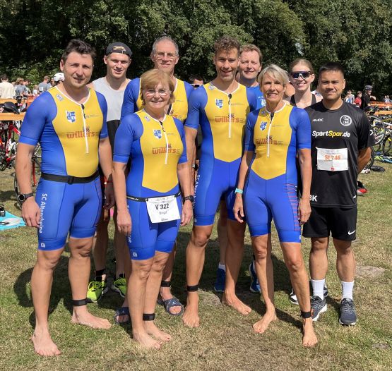 Traditionell ist der Volkstriathlon das Hauptrennen in Riesenbeck, auch wenn sich die Strecke in den letzten 41 Jahren mehrfach geändert hat. Mittlerweile müssen die Volkstriathleten eine 600 Meter lange Runde schwimmen, die 6,7 Kilometer der Radrunde drei Mal absolvieren und fünf Kilometer um den See laufen. Vom ersten Meter des Triathlons war Jan Veldhuis mit in der Spitze des gut besetzten Feldes des Volkstriathlon. Nach nur 8:58 Minuten wechselte er zur zweiten Disziplin. Bei der zweiten Durchfahrt des sehr unübersichtlichen Bereichs des Radaufstiegs kam es aus Sicht des SCA zur fatalen Fehlentscheidung. Eine sehr volle Strecke, eine Überholverbotszone und ein Wettkampfrichter mit wenig Gespür wurden Veldhuis zum Verhängnis. Er wurde disqualifiziert, beendet aber sein Rennen noch als Gesamtzweiten nach 56:41 Minuten. Manfred Ricklin hatte schon beim Training für den Riesenbecker Triathlon ein gutes Gefühl. Das bestätigte sich am Sontag. Mit sehr guter Radzeit und zwei schnellen weiteren Disziplinen belegte er nach 1:06:49 uneinholbar den ersten Platz in der AK 65. Nur 22 Teilnehmer der 251 Athleten waren schneller als der 65 Jahre alte Ausnahmeathlet. Nach dem Schwimmen dreht Vitali Schmidt richtig auf und lief mit 21 Minuten eine sehr gute Zeit. Belohnt wurde die schnelle Zeit nach 1:08:18 Stunden mit dem vierten Rang in der AK 35. Petra Romberg war etwas überrascht, als sie bei der Siegerehrung als Gesamtzweite aufgerufen wurde. Als Siegerin der AK 50 hatte sie bis auf die Gesamtsiegerin nach 1:11:12 auch alle anderen Konkurrentinnen mit drei sehr ausgeglichenen guten Leistungen hinter sich gelassen. Birgit Bölker überzeugte vor allem auf der Radstrecke und freute sich über den vierten Platz in der AK 55, den sie sich nach 1:21:15 Stunden erkämpft hatte. Lutz Brüning war nach zwei Kilometern auf dem Rad enttäuscht Mit einem Platten musste er das Rennen aufgeben.