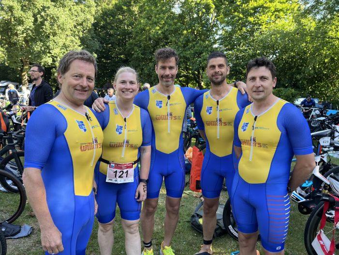 Gut 600 Meter war die Runde im Saerbecker Badesee lang. Und die Verbandsligsten zeigten gleich auf den ersten Metern, dass in dieser Liga von Beginn an mit Vollgas Sport betrieben wird. Nach 300 Metern musste Jan Veldhuis den Kontakt zur Spitzengruppe leicht reißen lassen. Mit weniger als 30 Minuten für die zwanzig Radkilometer fuhr Veldhuis weit nach vorne und bestimmte das Rennen der Verbandsliga mit. Auch auf den sehr gut zu laufenden fünf Kilometern des letzten Teils dieses Triathlon etablierte er sich auf den ersten Rängen der Verbandsliga. Nach starken 1:02:12 Stunden erreichte er als Fünfter die Ziellinie. Wenn Christoph Börger auf dem Rad sitzt, schaut die Konkurrenz meist nur hinterher. Mit einer starken Leistung im mittleren Teil des Dreikampfes schob sich Börger (1:09:43 Stunden) auf den 29. Platz der Liga vor. Auch für Vitali Schmidt beginnt der Wettkampf erst richtig, wenn er festen Boden unter den Füßen hat. Auf dem Rad und besonders auf der Laufstrecke, für die er nur 22:46 Minuten benötigte, legte er den Grundstein für Rang 42. Im Ziel war Vitali Schmidt nach 1:12:16 Stunden. „Locker bleiben und das Ziel erreichen“ war das Motto für den Start von Ralf Uhlenbruch. Nachdem ihn beim Training die berühmte Hexe in den Rücken geschossen hatte, war das Erreichen der Finishline das Ziel. Nach 1:25:58 Stunden hatte er diese erreicht und so die Strafpunkte für die Mannschaft abgewendet.