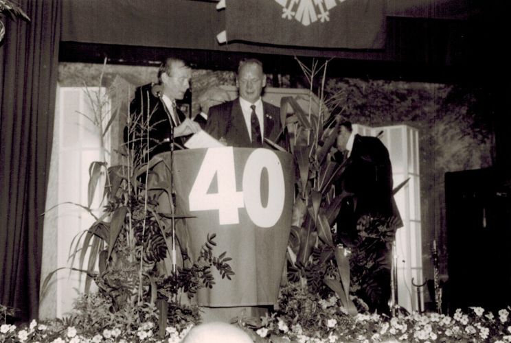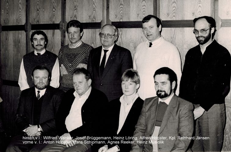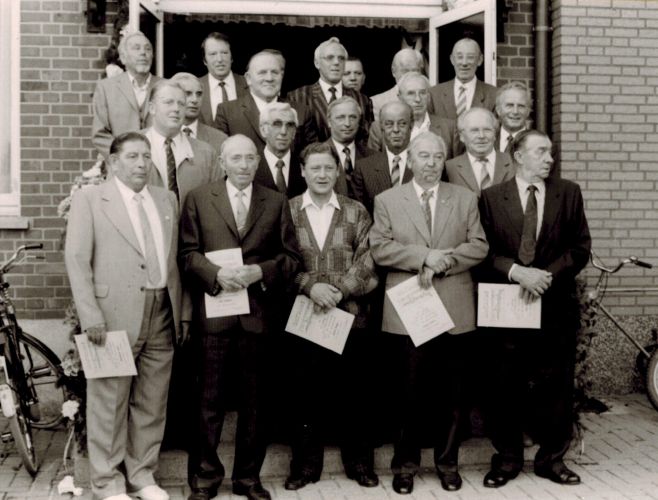 Festkommers bei Rielmann - Jubilare - hinten v.l.: Theo Dropmann, Willi Budde, Clemens Göcking, Hubert Hermes, Hubert Kösters, Alois Pötter, Josef Brinker - mitte v.l.: Alfons Schwindel, Karl Hopster, Alfons Hopster, Josef Kösters, Ewald Robert, Karl Akamp, Karl Lammers, Josef Hopster - vorne v.l.: Bernhard Lüke, Karl Bäthker, Anton Thape, August Heeke, Karl Brinker