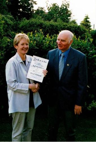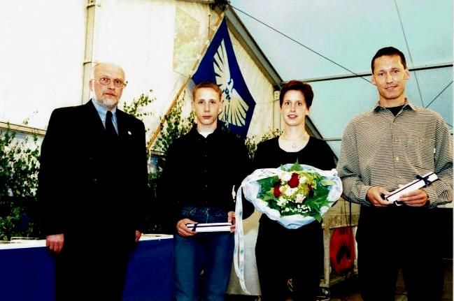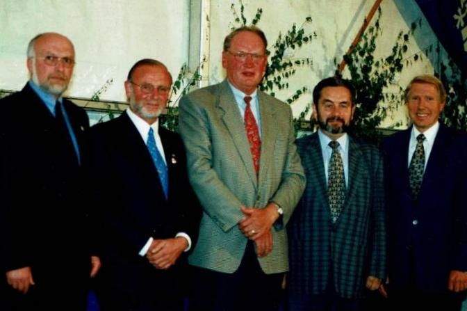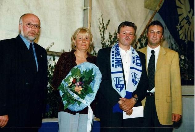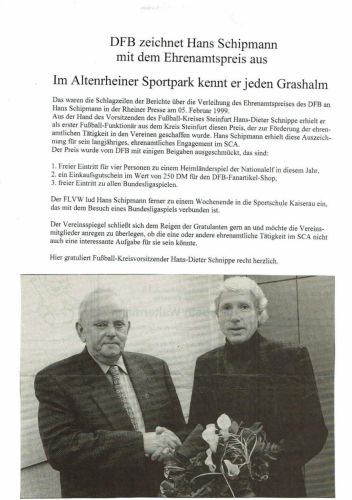 Für langjährige Verdienste um den Sport überreichte der Vorsitzende des Fußball Kreises Steinfurt, Hans-Dieter Schnippe, die silberne bzw. goldene Ehrennadel des FLVW - von links: 1. Vorsitzender Jörg Brandhorst, Anton Hopster (Silber), Bernhard Schmees (Gold), Heinz Musiolik (Gold), Kreisvorsitzender Hans-Dieter Schnippe