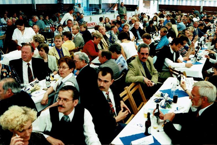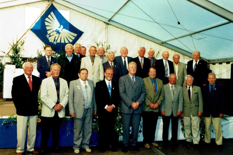 Jubilare - Männer der 1. Stunde: hinten v.l.: Anton Thape, August Heeke, Karl Hopster, Hubert Kösters, Franz Drees, Aloys Pötter, Karl Bietmann, Klemens Göcking, Alfons Hopster, Franz Hopster, Karl Bäthker, Karl Akamp, Karl Lammers, vorne v.l.: Heinz Hornung, Josef Hopster, Bernhard Lüke, Anton Hopster, Alfons Schwindel, Willi Budde, Josef Kösters, Alfons Wiesch, Reinhold Heeke