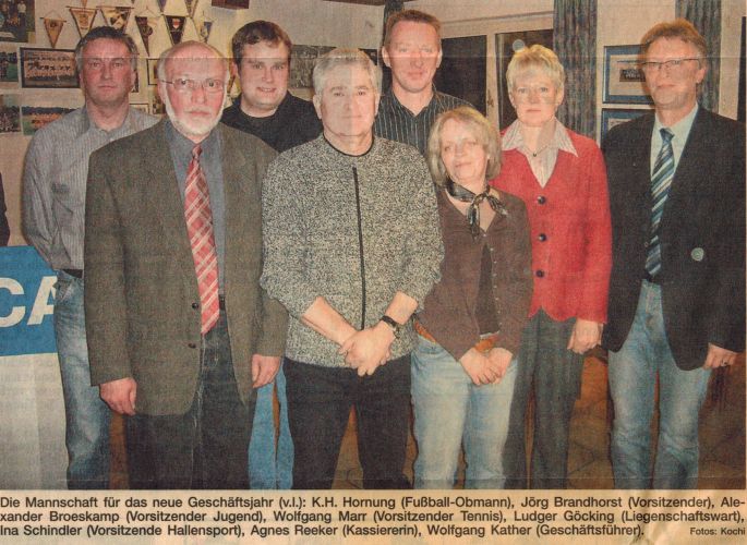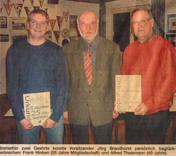 Jubilarehrung - 60 Jahre Vereinsmitglied - hinten v.l.: Wolfgang Kather (Geschäftsführer), Agnes Reeker (Kassiererin), Franz Hopster, Heinz Hornung, Alfons Wiesch, Josef Kösters, Josef Hopster, Hermann Hofschröer, Hubert Kösters, Karl Göcking, Karl Bietmann, Alfons Schwindel, Jörg Brandhorst (1. Vorsitzender), vorne v.l.: Bernhard Lüke, Anton Thape, Reinhold Heeke, Karl Lammers, Alfons Hopster, Gerhard Südhoff, Franz Drees, Anton Hopster